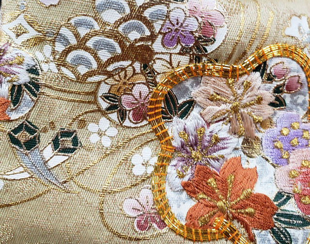 男雛の衣装には破れ青海波、宝尽くしなどの文様が金彩刺繍の豪華な衣装のお雛様